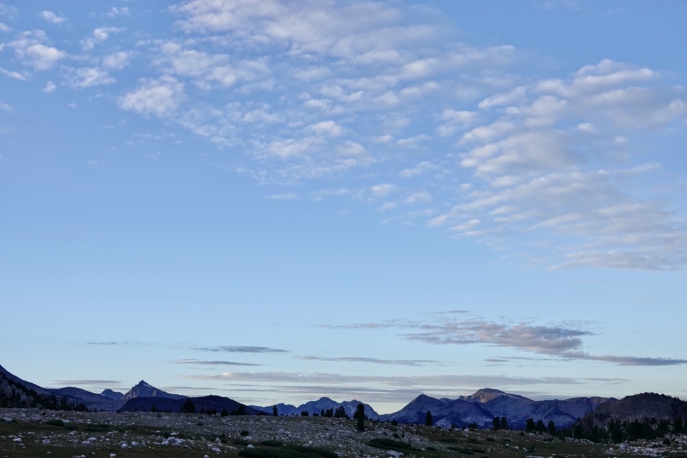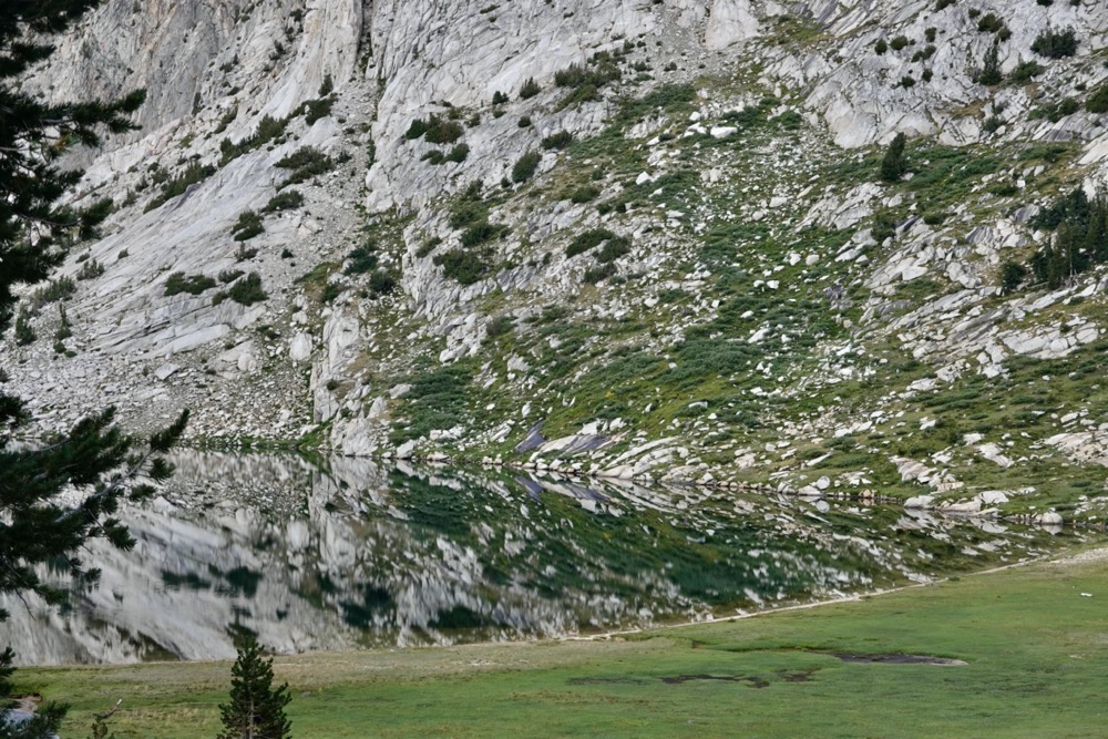 A dusty morning sunrise through the tent mesh at 6am. It was the best of the trail yet, and no surprise there. This camp had the best view by a long shot and so we soaked it in over tea and breakfast cookies. Our basin was still shaded, but the east-facing faces of the southern peaks glowed like hot steel. Silver Divide Lake puddled glassily, reflecting the brightening hues of the surrounding rim in a disturbingly clear mirror image. If I hadn’t known better, it looked more like bushes and rocks than water. I found where I could poop, and watched the marmots graze in the meadow below like cattle. They oozed a couple of fluffy steps at a time. When stationary, their mottled reddish coats made them look just like the scattered rocks that had tumbled from above.
