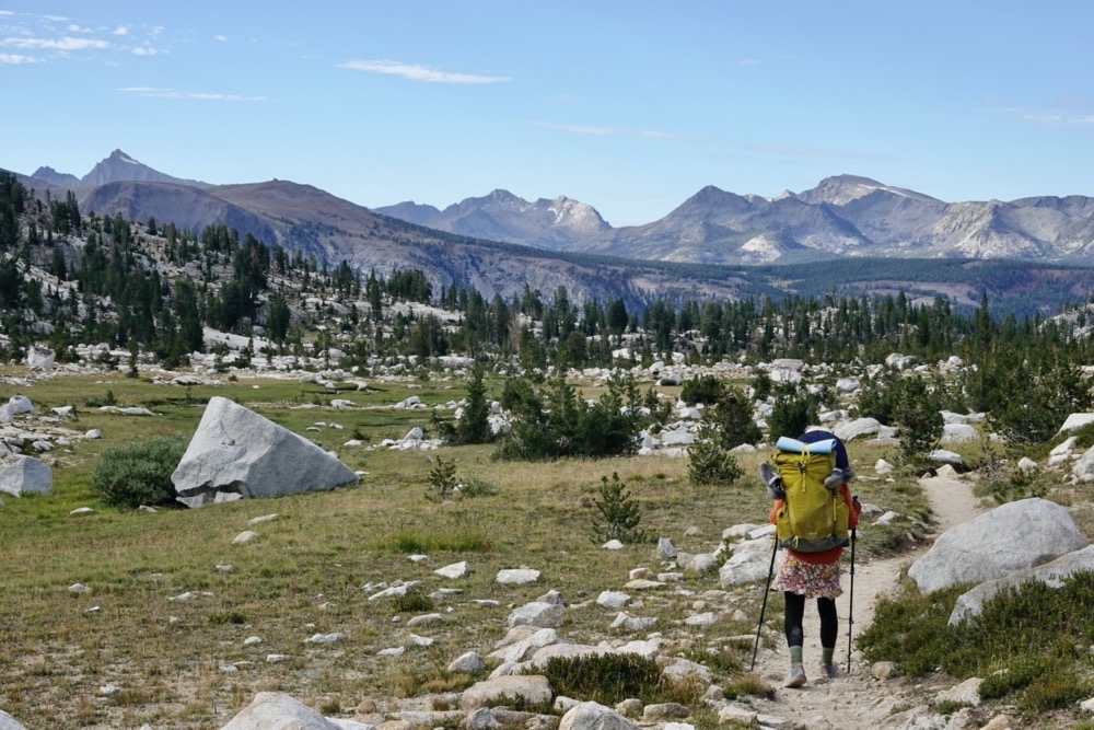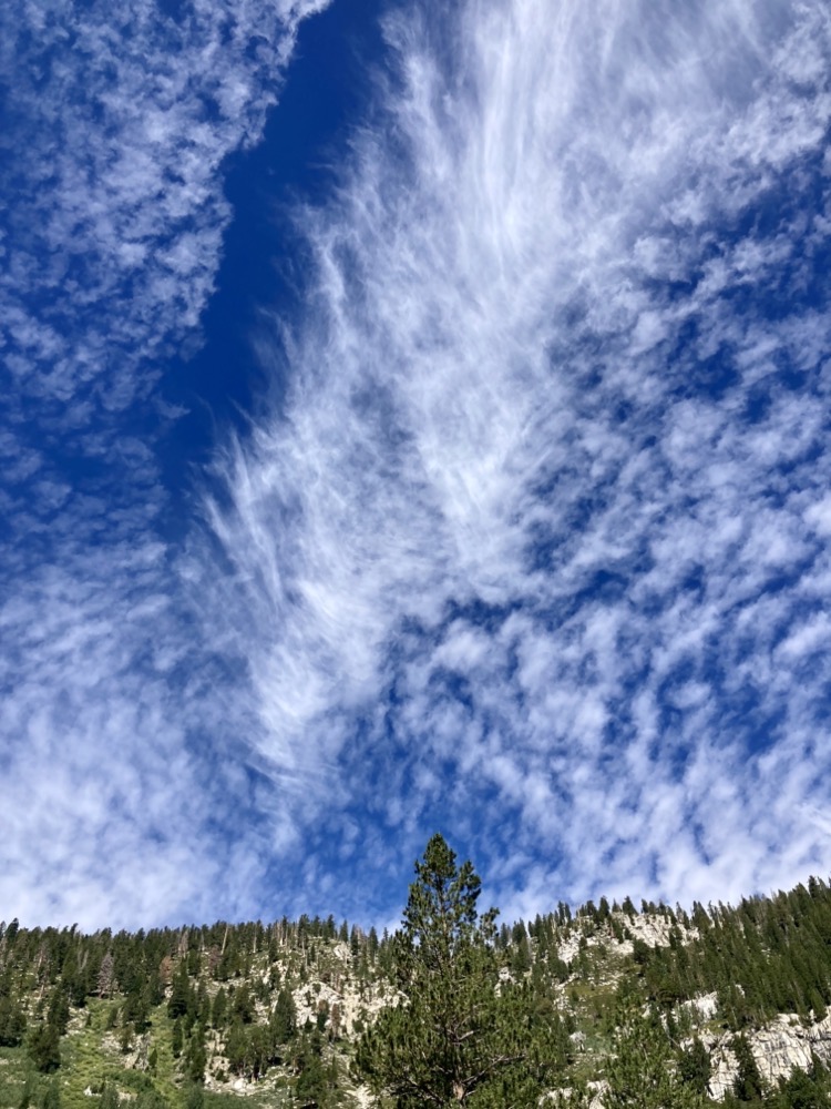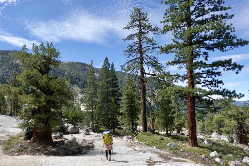 We were moving at 8am, easily meandering along the relatively flat basin. But gradually, the trail became rockier and steeper until we were perched above a deep ravine. We couldn’t see the bottom over the edge, but we could hear a torrent raging. Flower Power powered over the rim dropping out of sight with a turn of the first switchback, no time for me to snap a photo. I followed her onto the ladder of short steep turns, laboriously constructed out of boulders and dirt. Every other turn brought us back to a sheet cliff where a granite dome steepened to vertical. First, we were level with its crown, then we were far below, gradually working closer to a flat in the forest.