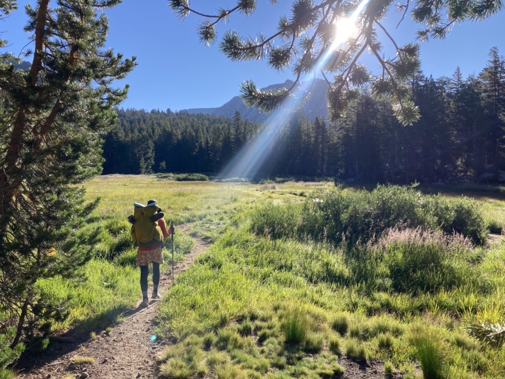 There were only four miles to MTR, and they were all downhill. However, not all slopes are created equal, so we were pleased to find the tread mostly smooth and rock-free. Dewy drops sparkled in the damp meadow where we had collected water yesterday evening, then we plunged back into shade under a high canopy of pine. Stripes of sunlight filtered between the trunks, lighting the belly-high grasses and flowers in a mesmerizing glow. Shadow and light. Puffs of dust from our shoes.