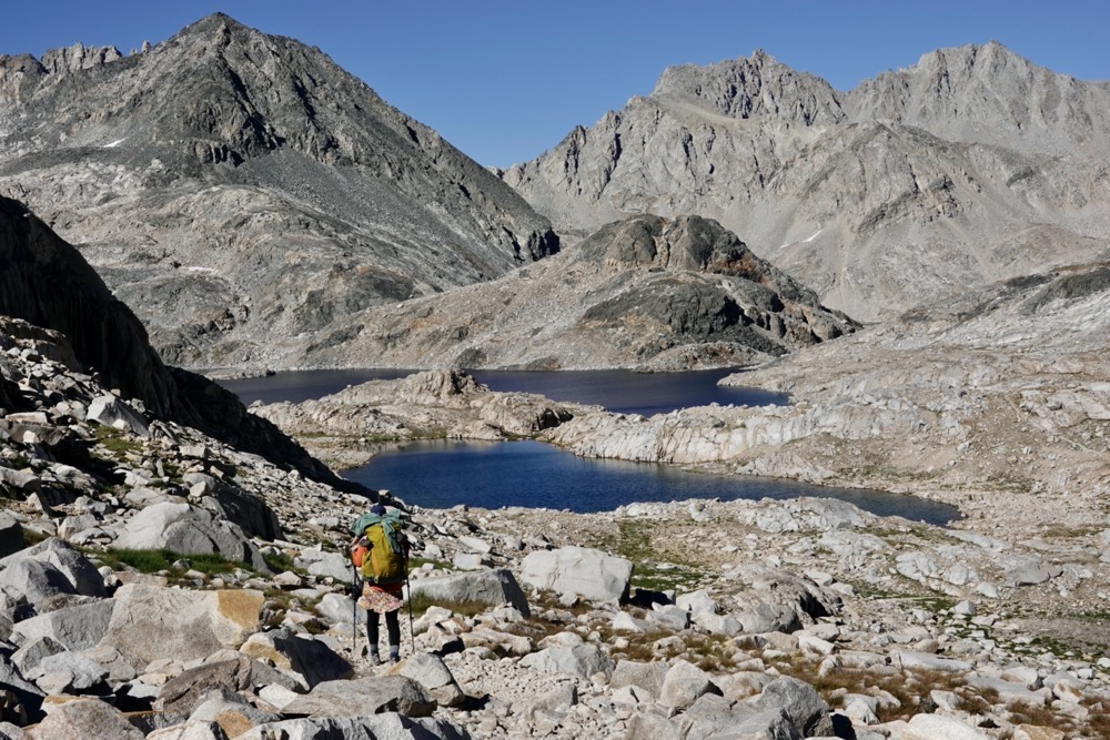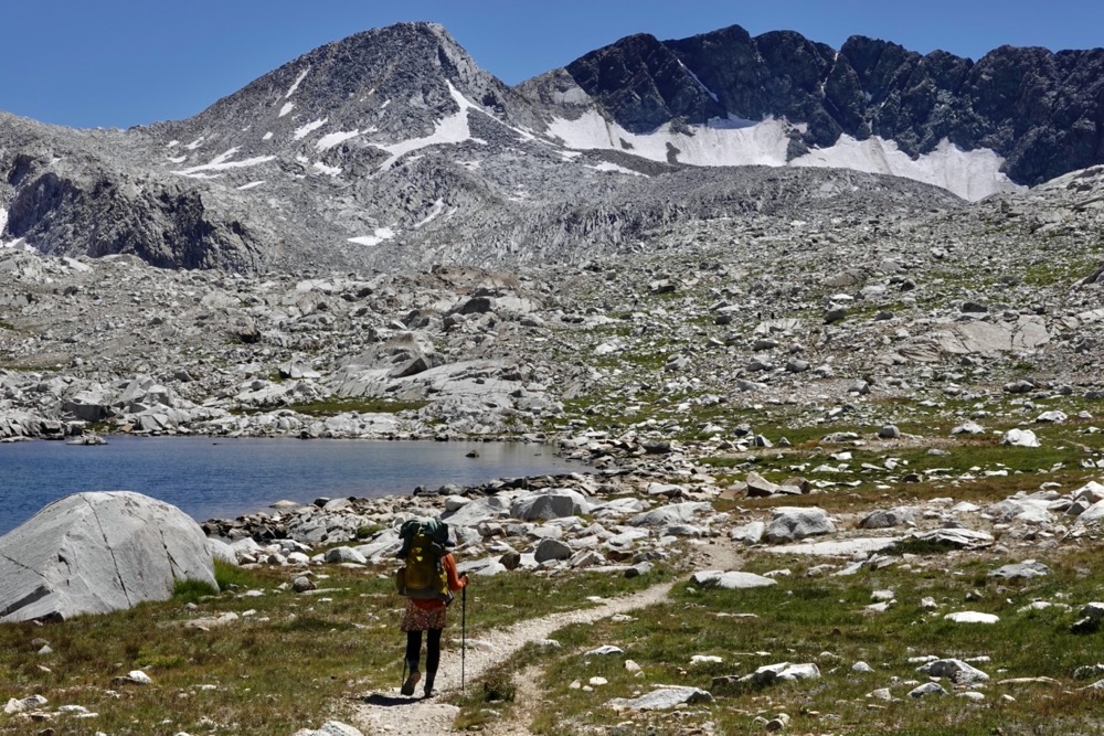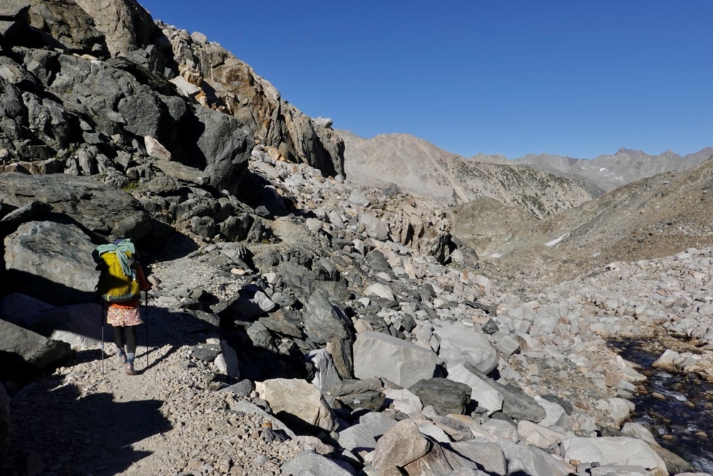 Alright, so when did the day get crappy, you may be wondering. It wasn’t during the final climb to Muir Pass. The scenery was still otherworldly and the trail smoothish. No, it was the subsequent descent from that strange stone hut that someone plopped on the pass. Not only was the trail way rockier and harder to follow, and thus slower and more draining, than expected, but the conga line of hikers coming in the opposite direction was truly shocking. They just kept coming, and they were probably saying the same thing about us. For as quiet as the JMT had been for us so far, the Evolution region seemed overrun. We were also stuck in the middle of a group of six moving in our direction. Their varied paces and odd personalities tried my patience, and I was glad to finally leave them behind at the crappy section of trail below Helen Lake.
