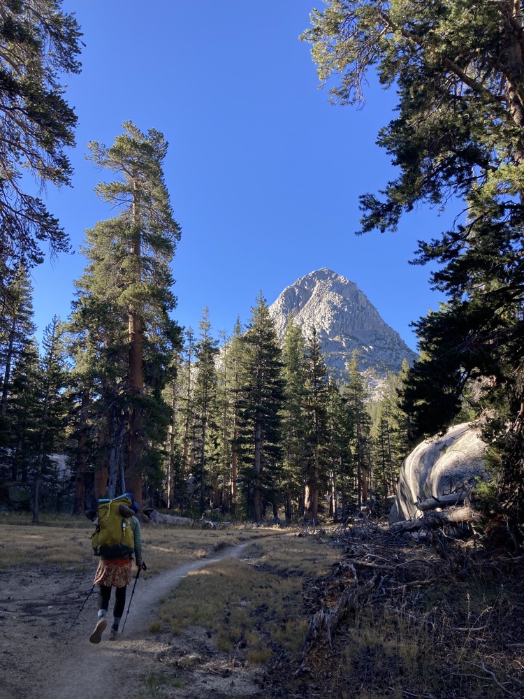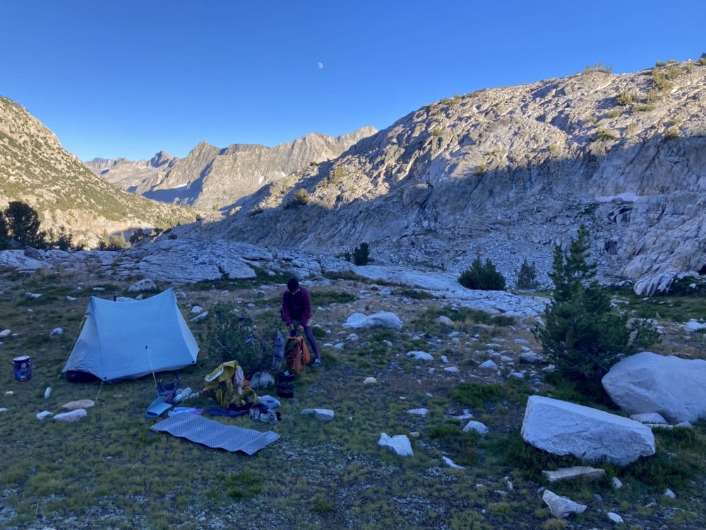 We were hoping that the sun would reach our part of the Evolution Valley with enough time to dry our stuff, but we ran out of things to do, and so lost patience. Plus, it was super cold and time to hike. So at 7:50am, precisely when the sun reached camp, we hoisted our packs and got moving. We could dry our damp gear at lunch.