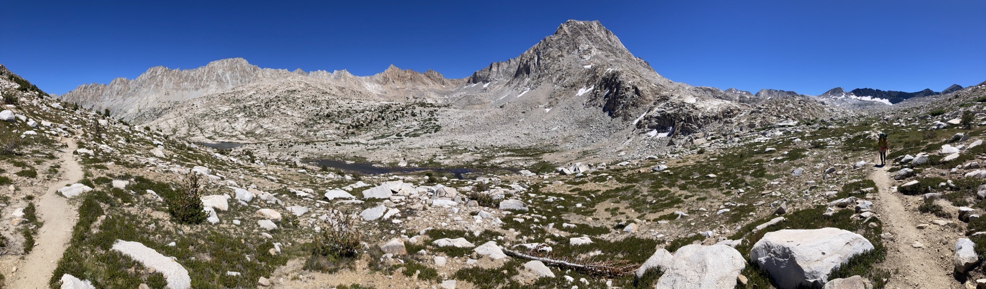Finally, we pulled ourselves out of the Evolution Valley and into Evolution Basin. It was the alpine equivalent of Disneyland, with endless opportunities to explore, ogle, and enjoy. The spires of Mount Mendel blended with the spires of Mount Darwin to our left, forming a formidable 13,000ft rim of split granite. Below, was the lower lobe of Evolution Lake, with a shore of green meadow surrounded by lumps of granite and stunted pine. The waters were ridiculously blue, like my vision was tinted by an Instagram filter. For miles ahead, I tracked the thin trail as it traversed between lake and peaks before disappearing around the bend into the upper basin. Tiny humans trudged along it in both directions, looking misshapen under colorful backpacks. It was good to be back.
