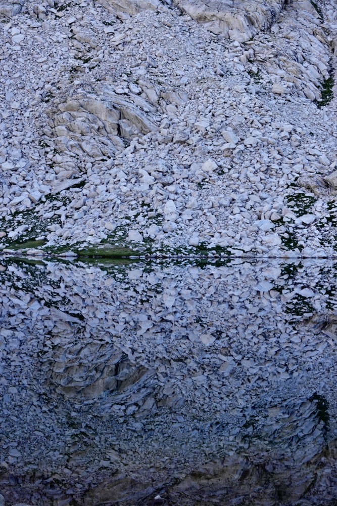 For several minutes while I crouched along the edge of oblivion, these mountains didn’t feel like home anymore. They were too dangerous and I didn’t want to die out here. A slip, a splash, a tumble down the smooth granite slabs where they rounded to a vertical falls. It could all be over so quickly. Oddly enough, we were just a few miles from where I had last had this feeling when Spice and I had been caught in a lightning storm during the SHR. Again, after I had looked my mortality in the eye, recreation in the mountains seemed pretty stupid and frivolous. Of course, there are a lot of ways to die, non-exclusive to backpacking, and the feeling faded quickly then, as it did now after I left the vertiginous edge and returned to camp.
