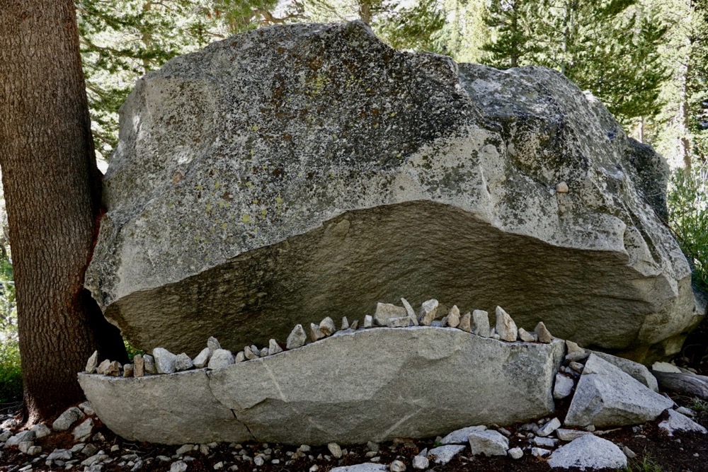 Down we went, deeper below the sharp peaks into the land of cascade and meadow. The trail remained rocky, but green things grew up to meet us as we twisted between the river and rounded cliffs of granite. Then finally, after navigating a wide slope of talus that was fragrant with the aroma of scrub in bloom, the tread turned to dirt and the grade eased. The toothy grin of a rock monster was there to congratulate us on finally getting down from Muir Pass.