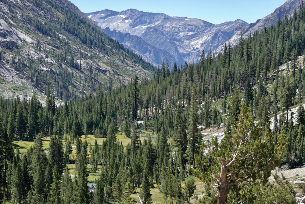 Soon we were past the ranger station and junction to Bishop Pass. Hopefully this would mean quieter trail ahead now that we were off the popular Evolution Loop. Some avalanche debris slowed us down intermittently, but otherwise, it was the trail of dreams. We chatted happily as the miles passed easily under the shady protection of the old forest.