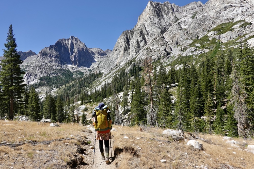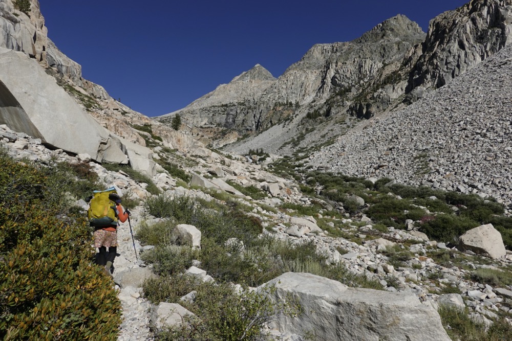 I dabbed away the blood with a damp handkerchief while asking a bunch of questions to kill time so that both of us could calm down. Finally, Flower Power got to her feet and took a few steps. Everything seemed good, but she was obviously shaken. Later at camp, after a grueling climb and another close call, Flower Power seemed wilted. Her melancholy was understandable, but it was heartbreaking. After hiking over 100 rugged miles, including the rocky garbage down from Muir Pass yesterday, all it took was one trip to strip away her confidence. With a lot more miles to go, how could she get it back? We needed it.