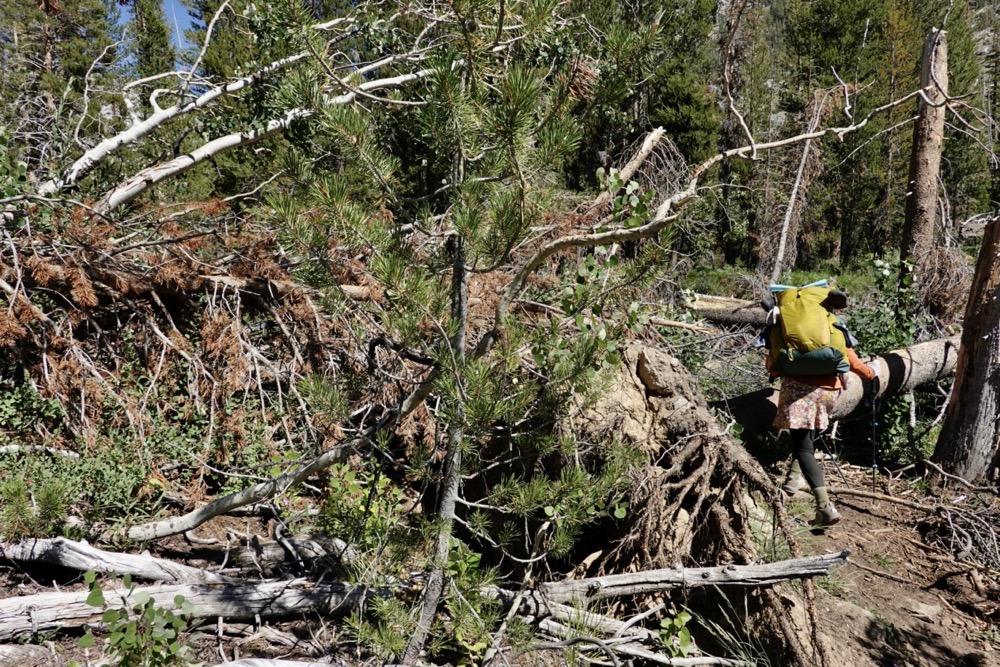 A minute after our water break is when Flower Power fell, obliterating what little was left of our morale. Already it was clear that the fallen trees had eliminated our stretch goal as an option. Palisade Lakes would need to wait until tomorrow. Now, even our minimum felt distant. But I put on my best optimism hat and kept us moving. Flower Power, to her immense credit, got right back to it even though I was sure that she wanted to be done hiking.