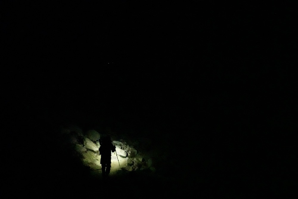 Just like every jerk who has packed up crinkly plastic things in the dead of night while others try to sleep, we stuffed our gear into our packs, failing miserably to muffle the horrendous cacophony that damn near echoed off the stars above. We had slept in our hiking layers, so I was warm and ready. There was just a frozen tent to roll and a chalky cookie to eat. By 3:40am preparations were complete. Under the bright light of the waning moon, we fist-bumped to start the day one last time. There was just one day left. “Let’s do this, Flower Power.”