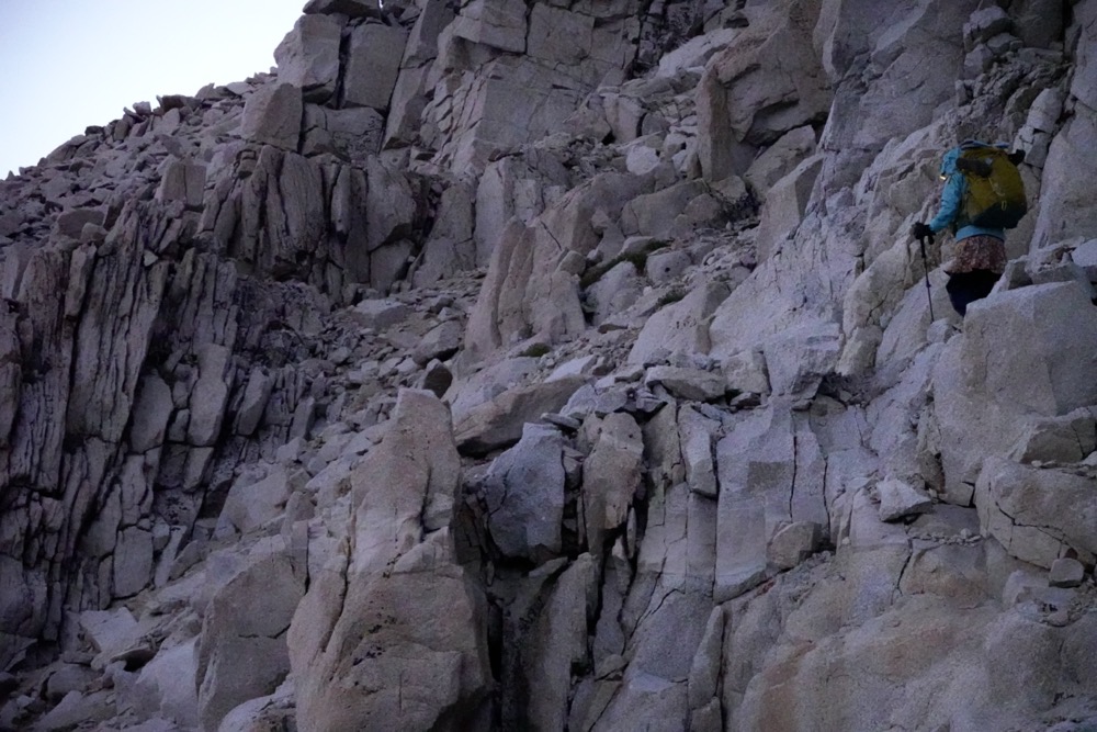 I remembered the awful feeling from the Southern Sierra High Route when I’d lost the nerve to attempt a traverse of Mount Baxter. It was the first and only time fear had turned me around in the mountains, though I probably should have a few other times, and it was a major bummer. Something had felt ‘off’ during the approach, turning me into an unpleasant sweaty knot of stress, and I’d agonized over the decision to give it a shot or backtrack to the easier route. Ultimately, Spice and I turned around, and I’d never forgotten the disappointment, even though I still pretended to this day that in following my gut we had avoided disaster. Here, high on Whitney, this felt similar. But we didn’t have the luxury of warm weather for an hour of deliberation. We needed action and movement.