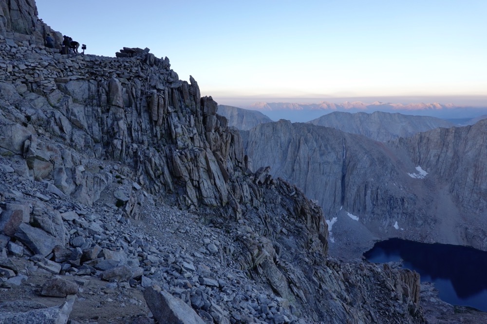 In our brief time on that corner, I did a lot of staring. I could feel the summit slipping away, so I kept swiveling my head back to gaze at the rounded hump, following the tiny people as they inched up the crest. Elsewhere, the horizon was a dusty rainbow of alpenglow, layering muted crimson on cool purple where the leading edge of day steadily squashed the shadows into the earth. All the mountains around us, there were a lot of them, crowded us now that we were higher with a longer perspective. Rather than defining the horizon, they were squeezed within it, filling to the brim with pink light. If it wasn’t so damn cold, this would have been the moment of the whole JMT. It was achingly beautiful. I tried to appreciate it in that way, but survival had stolen my joy.