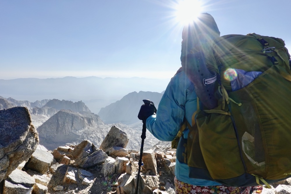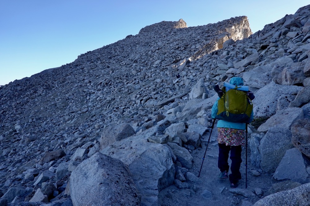Finally, Flower Power, my mom, made the call that I couldn’t — bail. I could hear in her drawn-out speech that we were in very real danger. We were done with the most physically strenuous part of the climb, and still we were trending towards moderate hypothermia, if we hadn’t arrived there already. Our layers were inadequate for the howling wind and freezing cold of dawn. It wasn’t our day. All the sun-soaked heat of the JMT so far didn’t matter a damn right now. And the ordeal didn’t end at the top. We needed to get down too. A long way down.