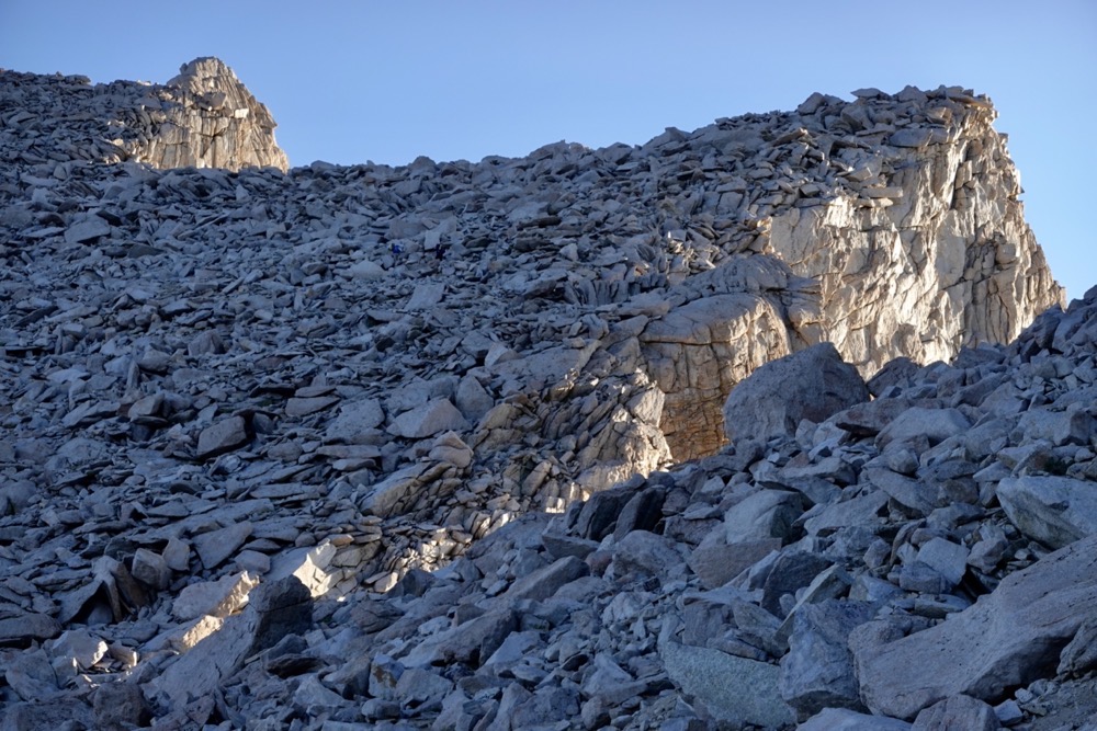 To our left was the brilliant escarpment of the Whitney ridge. The vertical faces of innumerable spires buzzed with light, gleefully shielding the warm rays from the one stretch of trail where we had really needed them. They filled me with longing for a different outcome. Getting over this was going to take some time.