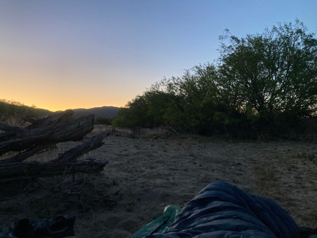 It was the perfect night, except that this new pad of mine sleeps like concrete, even on the soft sand. Oh well, I’ll either get used to it or not. I lay on my back, the least uncomfortable position, and watched the horizon brighten. A planet blazed in the grey sky, which must have been a good omen, because why not? Rolling over uncomfortably, I pushed up to sitting. What a magical morning.