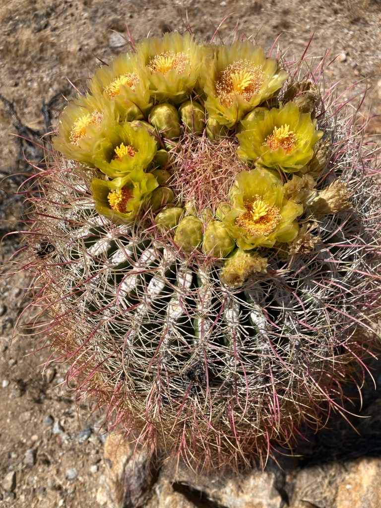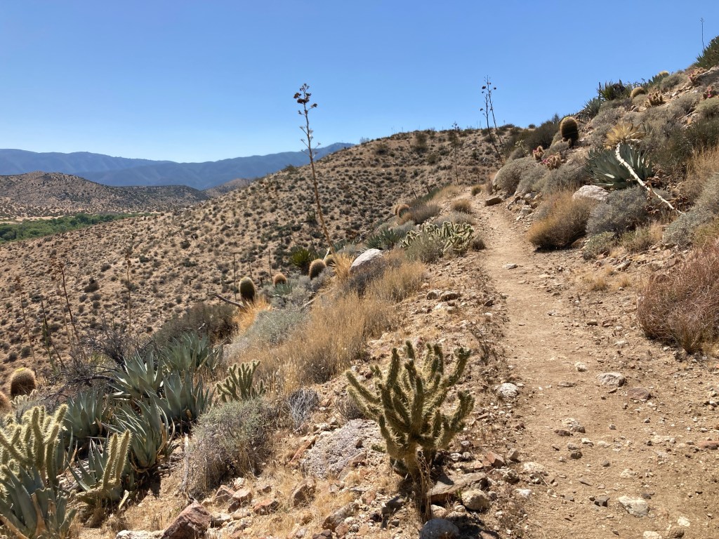 A mighty wind kept the temperature reasonable, which was great because the exposure was real. Switchbacking high into the San Felipe hills, this south-facing slope was even more sunscorched than yesterday’s desert. Barrel cactus? Where did you come from? Ocotillo twiddled their long, flowering fingers like freeze-dried octopus. Jumping cholla waited at each bend to hitch a ride. The narrow trail was good enough to safely navigate all the points and cliffs, but not by much.