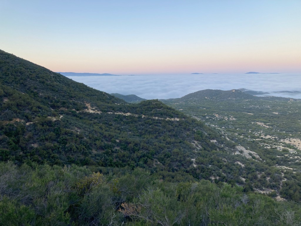 But first, the day. Birdsong accompanied me during the gradual climb above a bouldery valley that was partially filled with fog. The morning was otherwise quiet and peaceful, and I admired the undercast as the sun brightened the tips of the vapor waves. I also ate breakfast, flossed, and brushed. Multitasking!