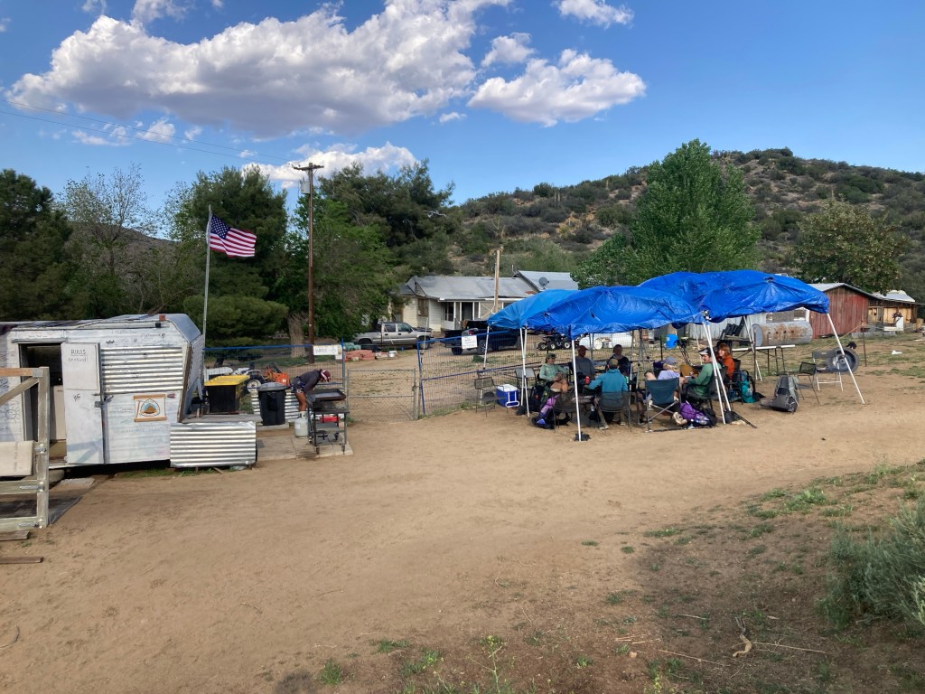 Mike 2.0 was a well-run ship. Eighteen hikers sat in the shade of four pop-up tents while Mike himself cooked up hot dogs. I beelined for the water spigot and quickly drank half a liter. Then I found a chair of my own, too tired to do all the other things that I needed to do.