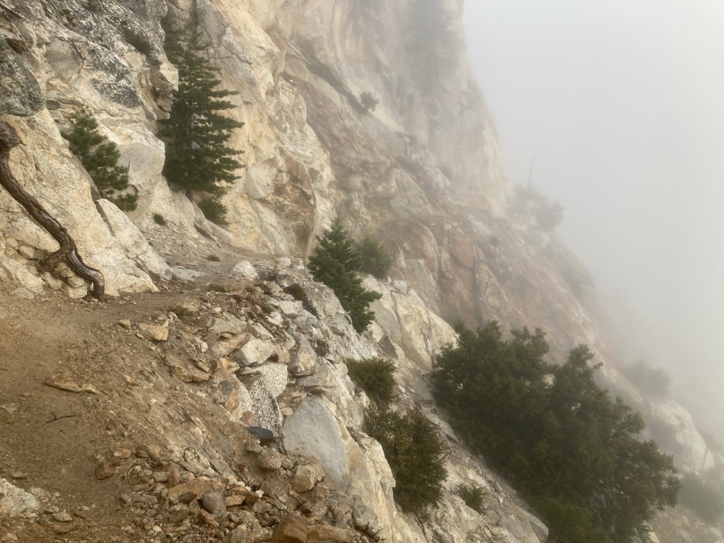 I woke up for good at 4:30am, still comfortably warm, but ready to be done with this foolishness. Still, I waited thirty minutes for the sky to begin brightening. Hiking by headlamp in a cloud doesn’t work very well.