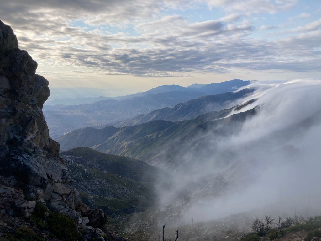 On the slopes of Red Tahquitz, it finally did. The cloud had almost broken a few times, but this long traverse finally brought me out of the mire for good. And what a sight to behold. Instant payoff for all the weirdness of the night and morning. A few points of the ridge combed through a waterfall of fog that crashed from west to east. There was the wind, plain to see, made visible by vapor, overwhelmingly persistent and endless. That cap of cloud had been so hostile when I was buried within it, but now it was beautiful. One of the most beautiful things I’d ever witnessed. It rushed and tumbled, soft and violent, like poisonous cotton candy or a deadly pillow fight. It poured, then disappeared into the desert, a perpetual filling of a cup that would always be empty. I thought of all the people still caught in the wave, who were enduring the bad, and hoped that they would get this view too.