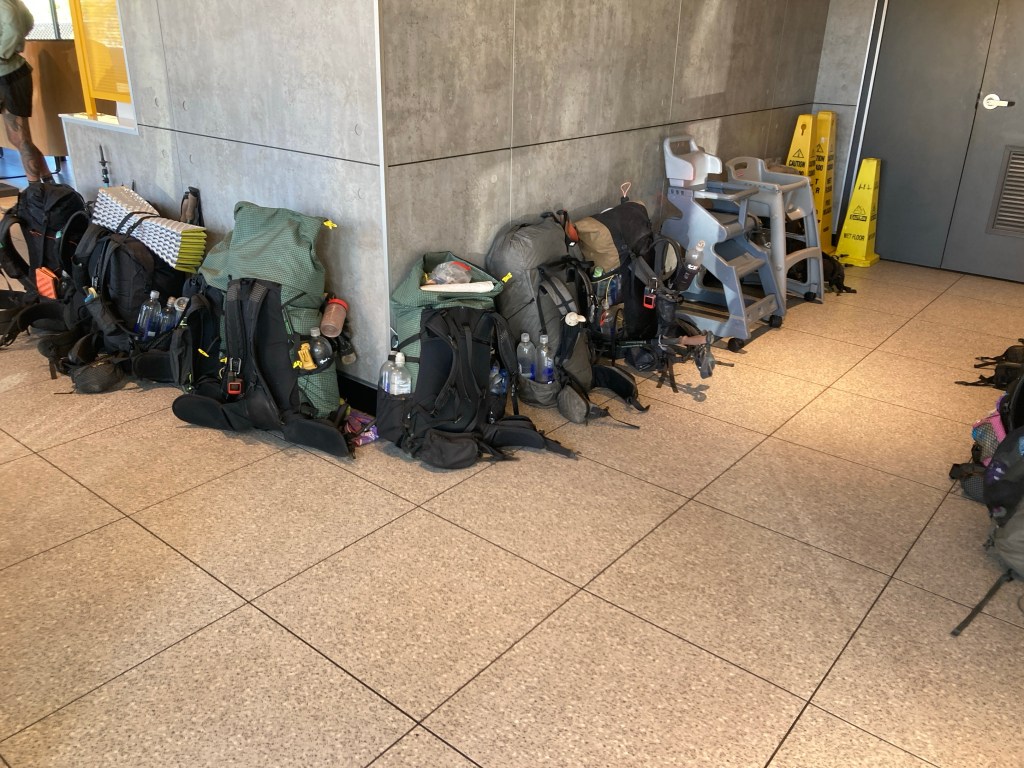 With cooled feet, I followed some friends inside and took a seat at a booth. This place had been remodeled since 2015, and it was nice. I grabbed a coffee and watched the others eat their fill. It took a few rounds, but they pulled it off. Then it was time to say goodbye. First two of them, then to three more after a trail angel picked us up and brought us to Wrightwood. Just me.