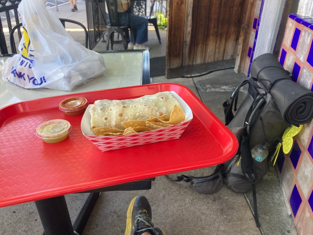 I had a burrito in my belly and a bag of them in my hand. My backpack was light, with minimal food and water, and the hip belt buckles dangled behind my knees, unneeded for the casual stroll. My left knee was still funky, but not bothersome on the flat sidewalk. My blisters were done giving me a hard time.